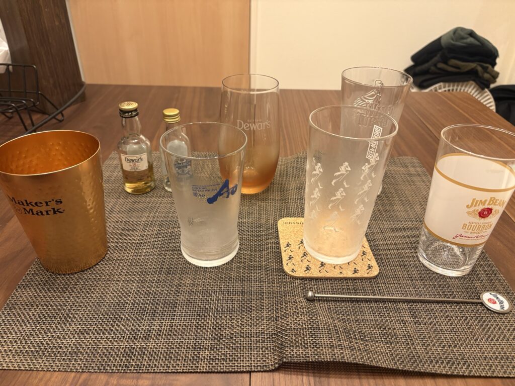 最もおすすめなのがグラス、タンブラーです。特に銘柄のロゴが入っていると特別感があって楽しめます。